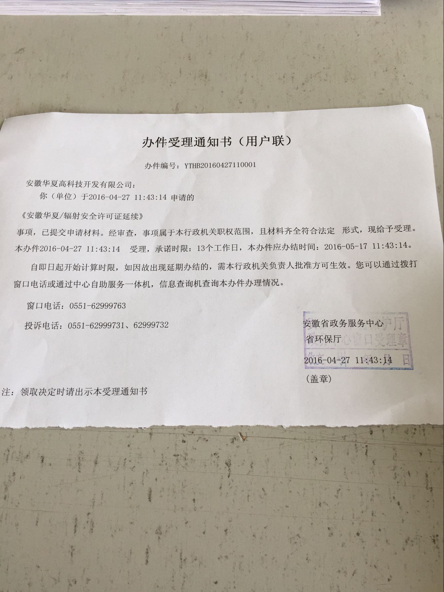 2016年4月27日公司通過了輻射安全許可證延續申請資料的審查,其中在無特殊情況下,公司將在2016年5月17日可以取得新的輻射安全許可證。