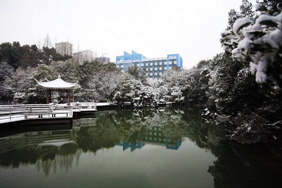 【發表時間】2015-01-28 瀏覽次數:0飛雪迎春到,瑞雪兆豐年。昨晚,2015年的首場雪飄然而至,今晨,美麗院區被皚皚白雪裝點得分外迷人,雪中綻放的臘梅、披上銀色外衣的香樟、迎風矗立的辦公樓、清幽的九曲橋、靜謐的挹翠亭……銀裝素裹的世界,好似一幅意境深遠的淡雅山水畫,給這個冬季增添了無窮詩意和歡樂。
